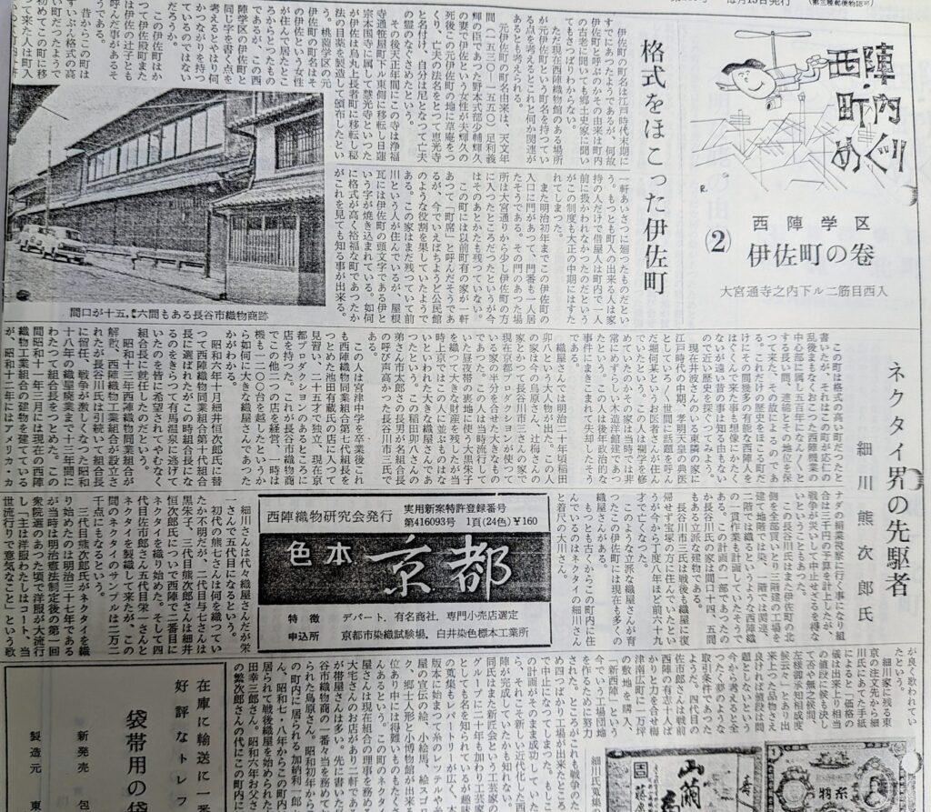 西陣の組合は、戦前は「西陣」なる機関紙が、戦後の同業会より連なる諸組合では「西陣たより」「西陣織たより」がそれぞれ発行されていました。この機関紙を確認してみます。