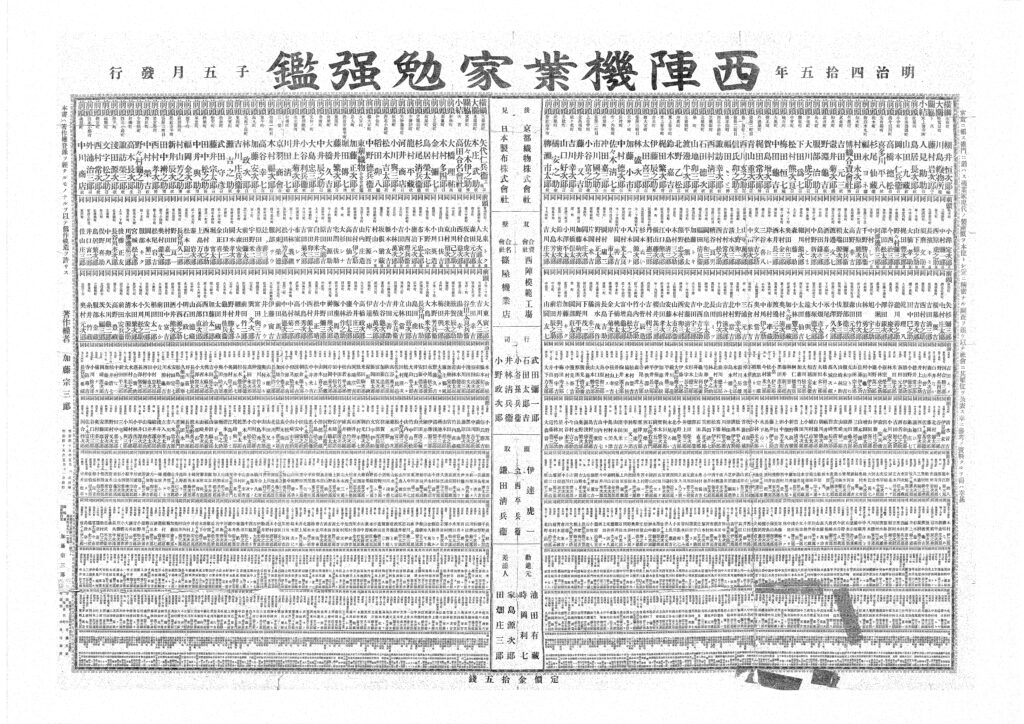さて、次に見てみるのが「西陣機業家勉強鑑」です。これは組合が以前公開を始めたもので、明治45年や昭和4年時点の西陣の勢力が分かるもので、昔の西陣の勢力図を調べるには、なかなか参考になります。