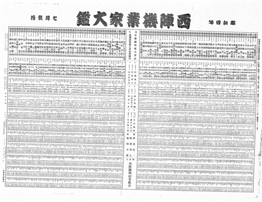 • ※ 矢代仁兵衛工場を中心に、時岡利七や巽文蔵など西陣の有力機業家が連合し、トラストを組んでいた。矢代仁は問屋が主だが、工場も併営している、当時の西陣屈指の大企業。今も室町二条に会社がある。